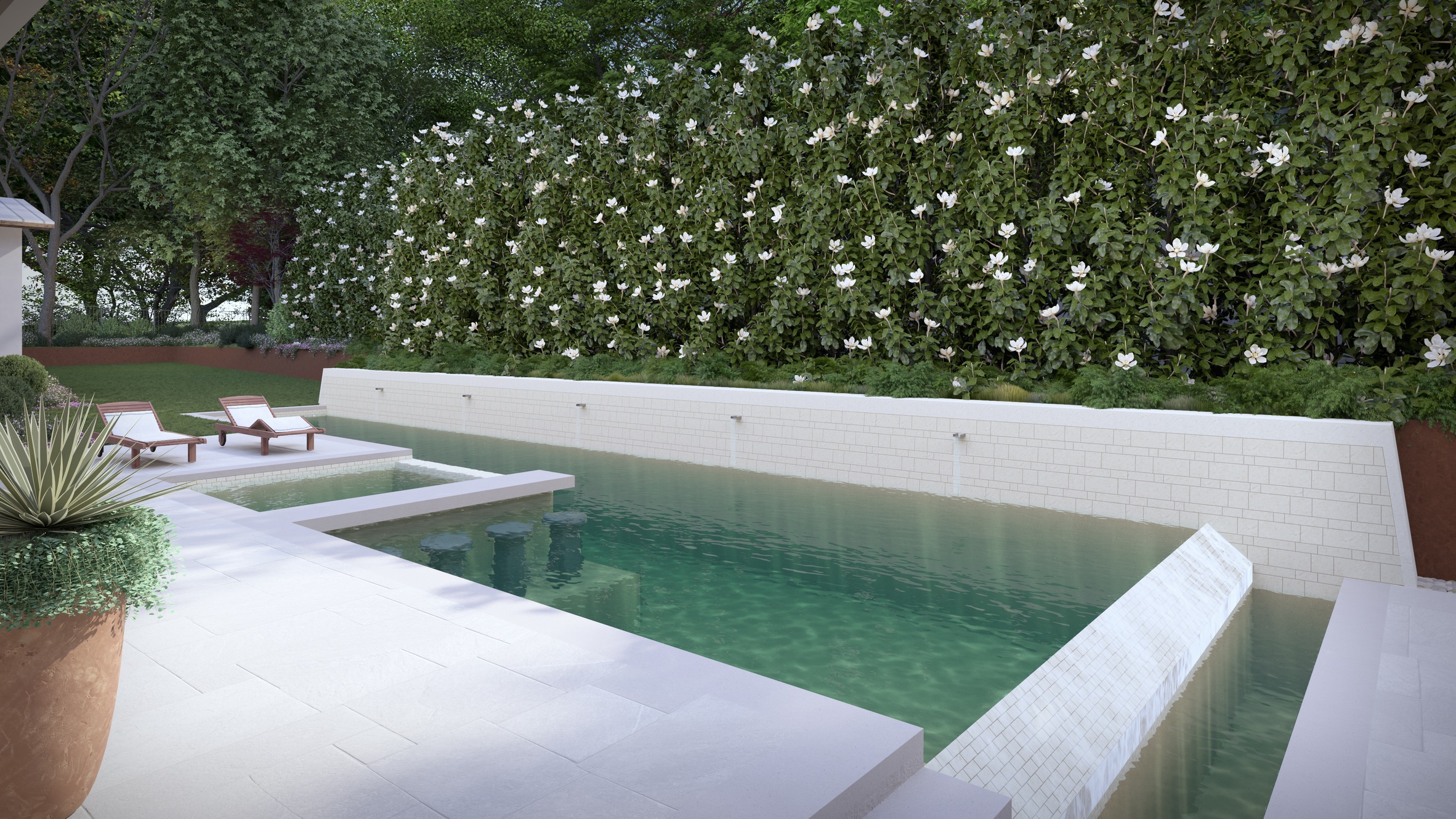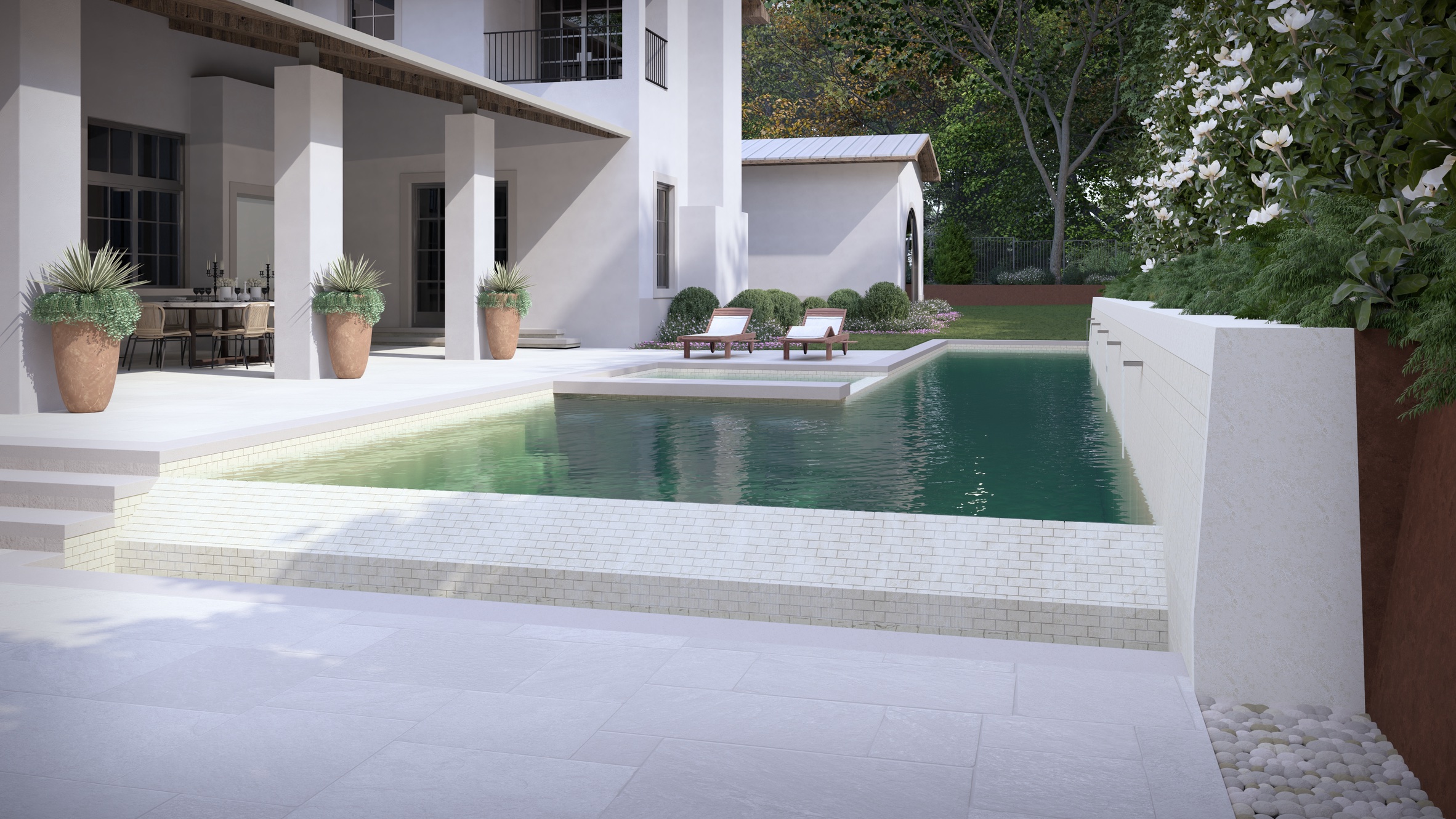 Wellness is elevated to resort level. A newly constructed, glass-lined gym overlooks the reimagined pool, complete with a built-in sauna and dedicated pool bath. Outdoors, the pool has been entirely transformed into a multi-experience aquatic environment featuring a lap pool, spa, negative edge, and sculptural water feature — all framed by mature magnolias and native landscaping for complete privacy.