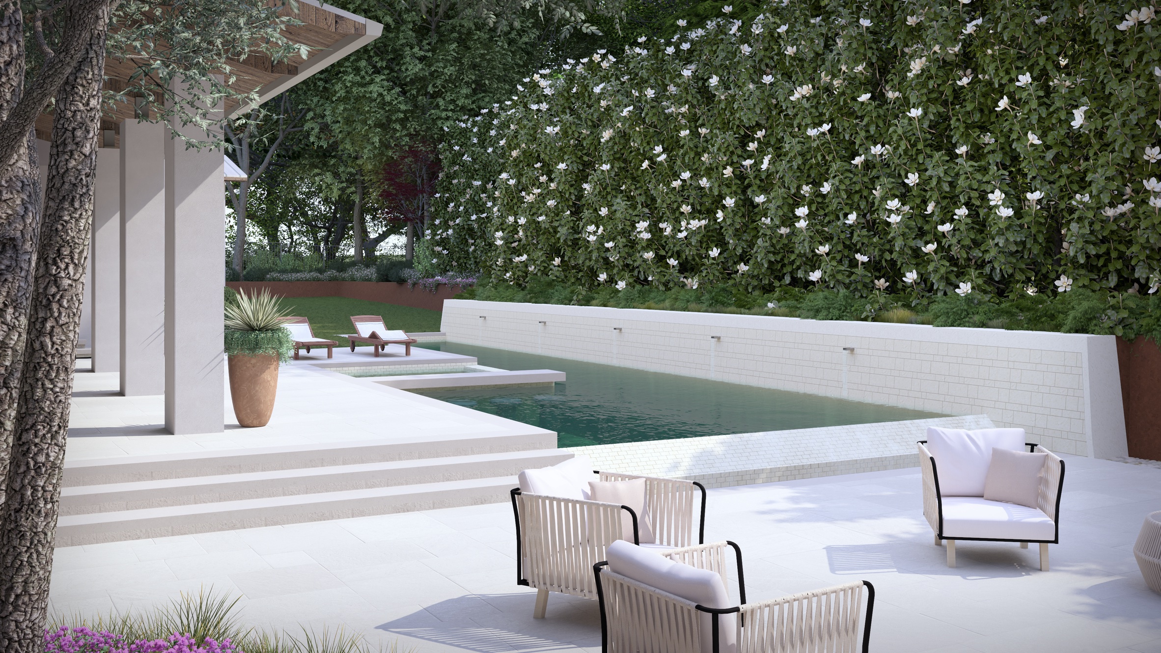 Wellness is elevated to resort level. A newly constructed, glass-lined gym overlooks the reimagined pool, complete with a built-in sauna and dedicated pool bath. Outdoors, the pool has been entirely transformed into a multi-experience aquatic environment featuring a lap pool, spa, negative edge, and sculptural water feature — all framed by mature magnolias and native landscaping for complete privacy.